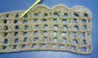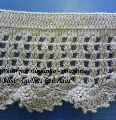 Começe com um cordao com 93 corr mais 3 para virar e formar o primeiro ponto alto, mais 1 ponto alto, pula 2 corr na mesma corr coloca 2 pontos altos juntos. Repete até o final.