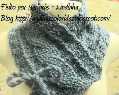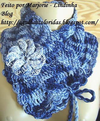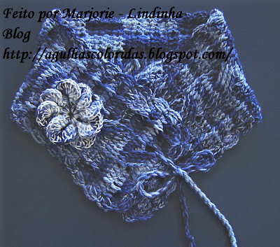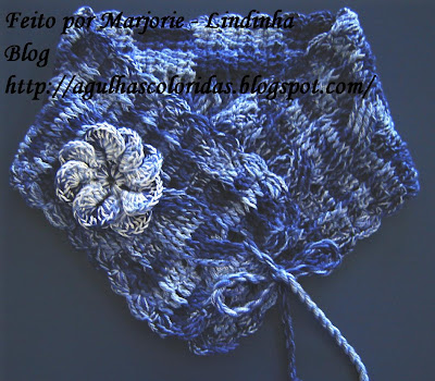 Como eu não quis fazer um cachecol inventei a Golinha Lindinha!!! Modifiquei um pouco o grafico e diminui os pontos para execução da gola, porque o grafico da amiga Sonia é para um cachecol e precisei adaptar um novo grafico para a Gola de croche. Modifiquei da seguinte forma: Fiz com um inicio de 21 corr mais 3 para virar e depois segui com 3 pontos altos 1 ponto alto pela frente, 3 pontos altos, 8 pontos em relevo para a trança e 3 pontos altos normal, 1 ponto alto pela frente e mais 3 pontos altos para finalizar. Executei assim por 70 cm e finalizei com biquinho toda em redor da golinha. Para amarrar fiz um cordãozinho mas quero testar a florzinha em trico que achei muito linda!! Inspirada nas golinhas que a gente anda vendo por ai vou confessar que achei essa um luxo!!